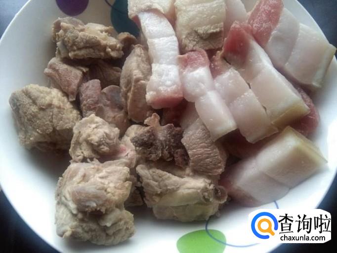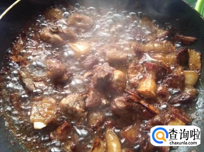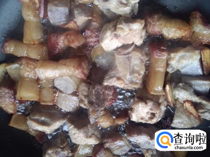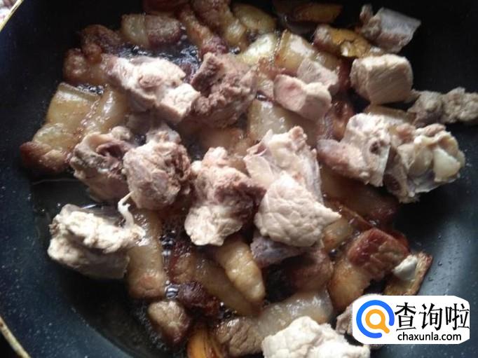 五花肉炒至表面微黄后,倒入骨头肉继续煸炒