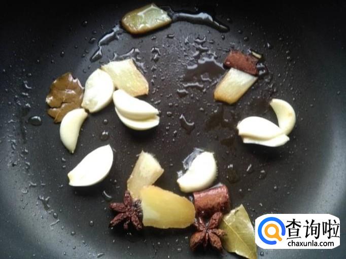 锅烧热,加入少许油,凉油将八角、桂皮、香叶、姜蒜炒香