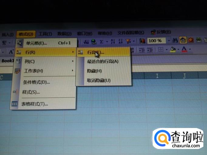 选定单元格之后,我们点击菜单栏的格式选项,在下拉菜单中,选择行,在右侧菜单中选择行高,在行高设置选项框中,输入我们想要的大小,这里假设把高设成10,然后点击确定,所有单元格的行高都是10了。