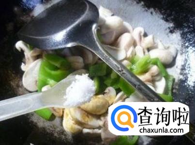 然后放蘑菇进去加适量的盐翻炒1分钟左右,再下辣椒进去,然后加适量的生抽、蚝油大火翻炒20秒左右,再盖上盖子中火焗3分钟左右就可以出锅了。【不用加水,因为蘑菇水份很多,菌类一定要煮熟透】
