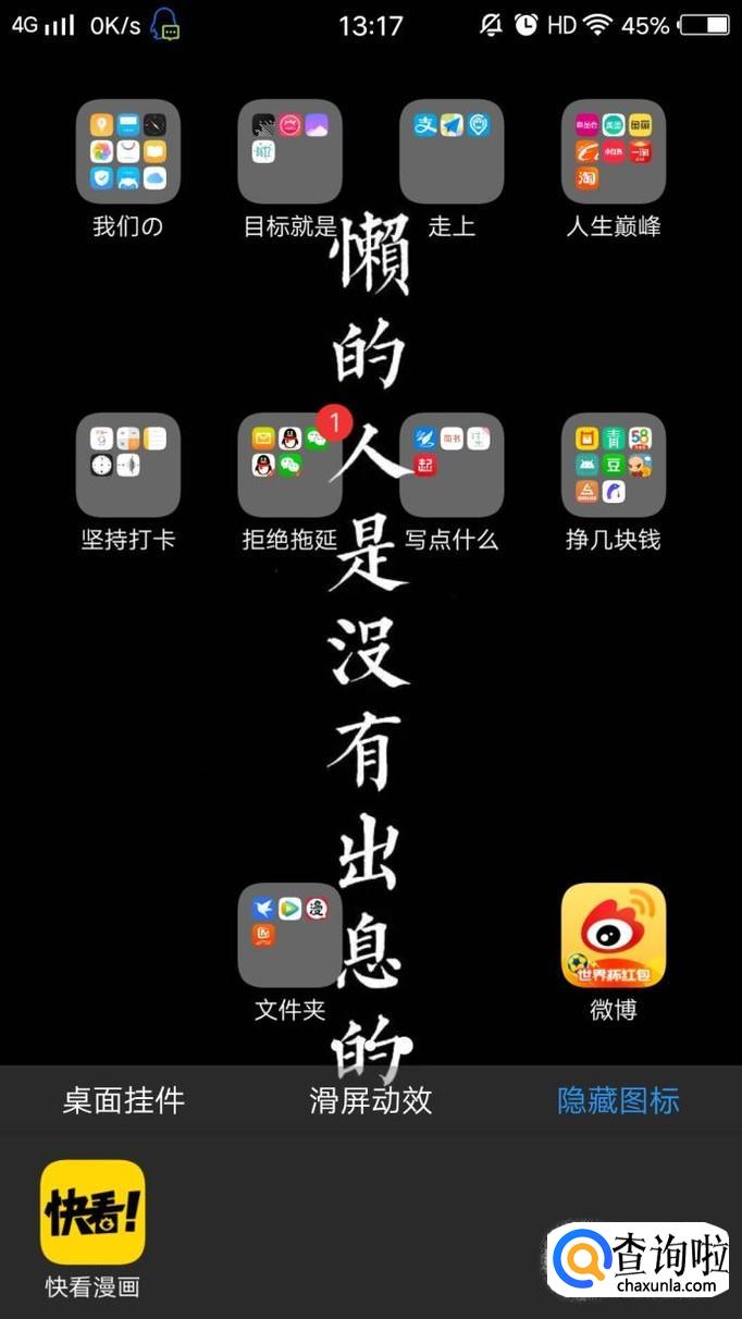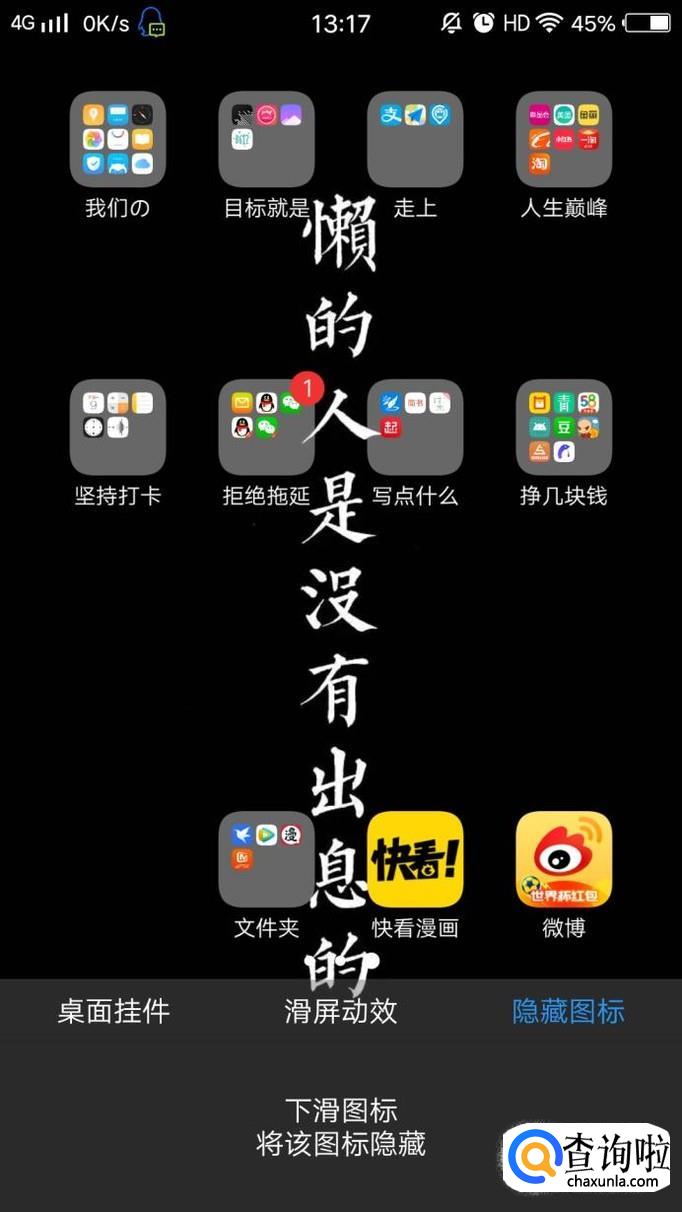 找到想要隐藏的图标,手指轻轻按住图标,下滑至底端隐藏图标这一栏。