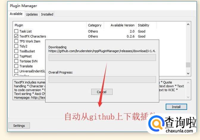 接下来插件管理器就会自动从Github中下载安装TextFX Characters插件,如下图所示