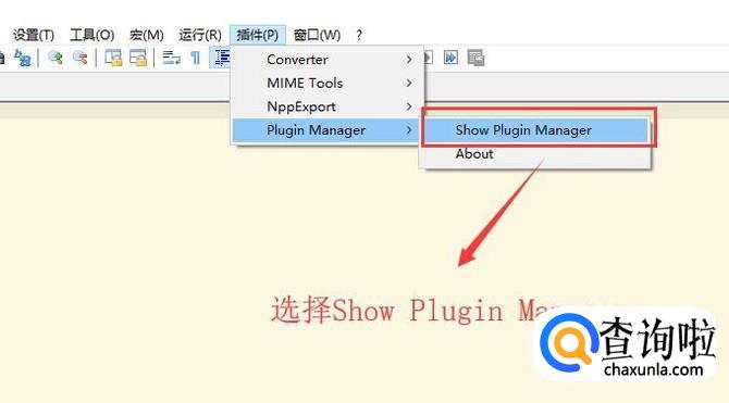 首先打开Notepad++软件,点击顶部的插件菜单,然后选择Plugin Manager下面的Show Plugin Manager选项,如下图所示