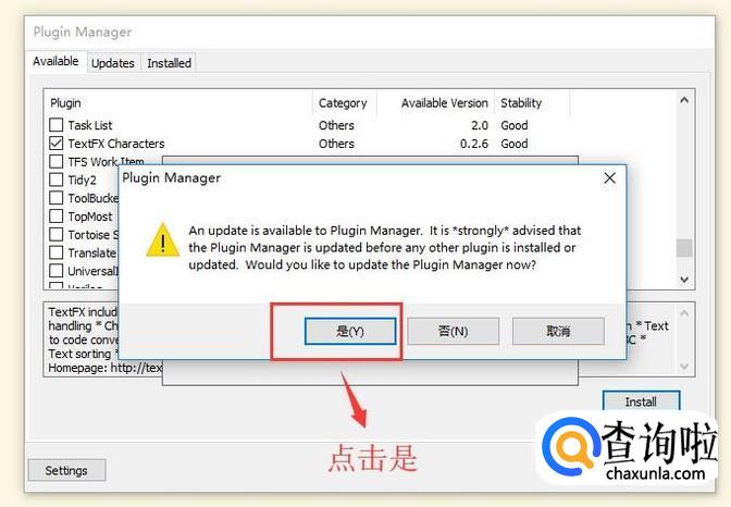 然后会弹出更新插件的提示,我们直接点击是即可,如下图所示