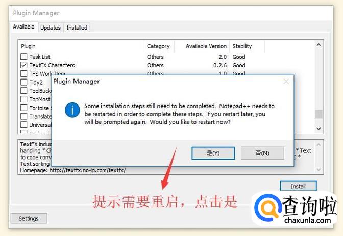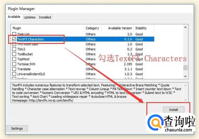 在弹出的Plugin Manager界面中我们勾选TextFX Characters选项并点击Install按钮,如下图所示