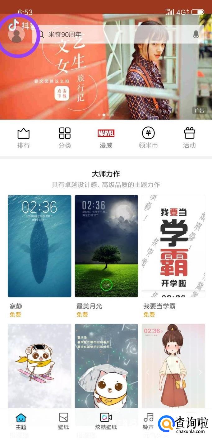 进入“主题”之后,浏览各种主题作品,看到自己喜欢的,先下载下来。然后点击左上角的“人物头像”,进入扩展界面