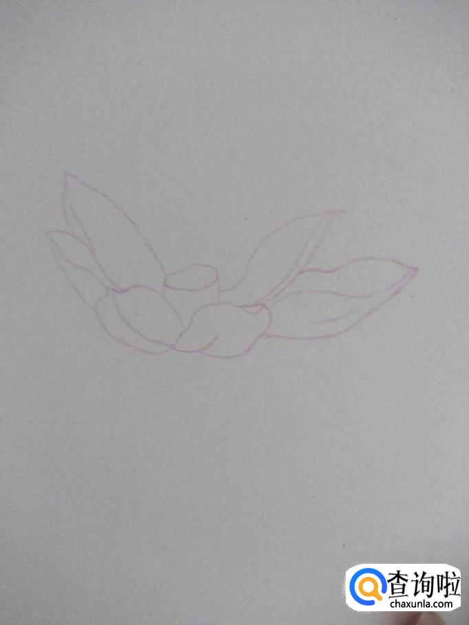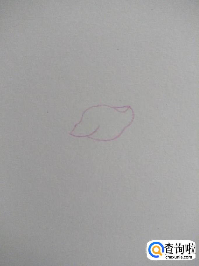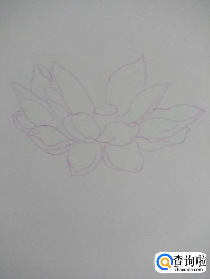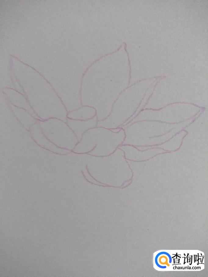 首先用粉红色的彩笔描绘出荷花的一小片荷花花瓣,然后在其另一侧画一片花瓣