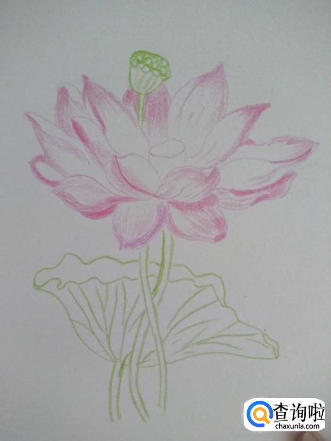 然后再用粉色彩笔给荷花绘色,在每片花瓣周围画上几笔