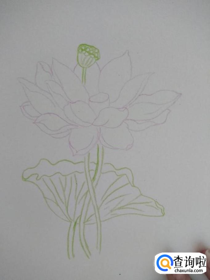 再然后用铅笔为荷花荷叶边缘绘色,增加真实感