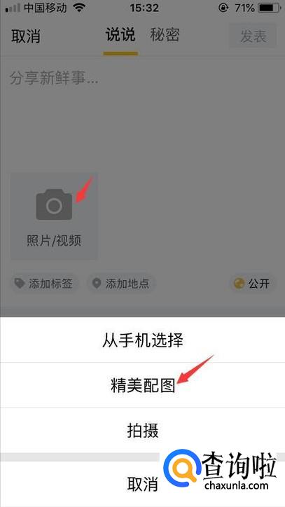 首先我们先登录qq空间点击发表说说,接着我们点击一下里面的照相机就会出现精美配图的入口。