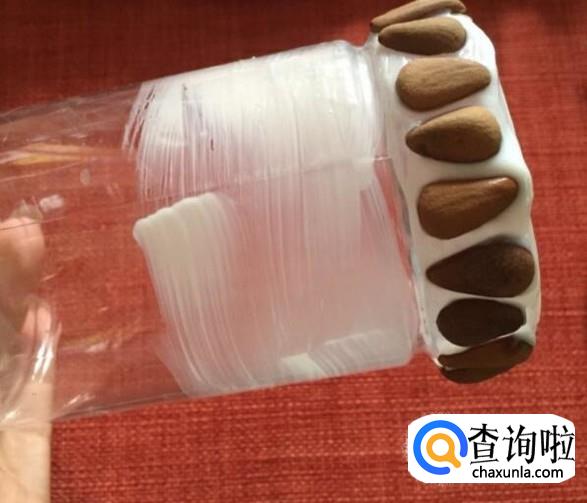 在刷了乳白胶的地方黏上松子壳,如果家里有坚果类的其他果壳也可以使用,混搭会更好看。