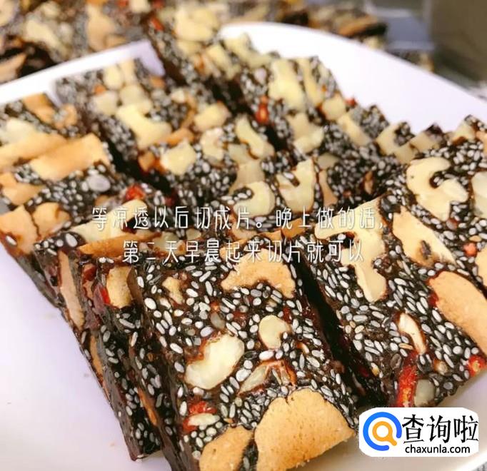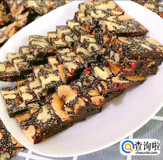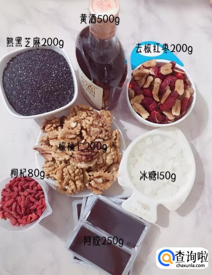 食材:黑芝麻200克,核桃200克,枸杞80克,阿胶250克,冰糖50克,去核红枣200克,黄酒500克。