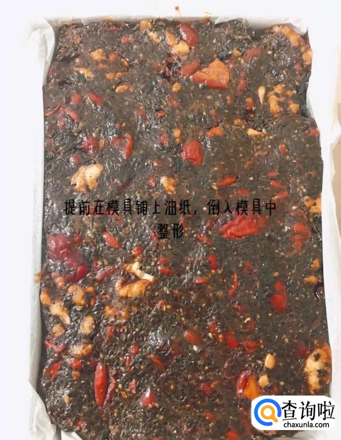 接着把熬好的阿胶糖平铺到事先准备好的容器当中,平整好放凉,如下图所示。