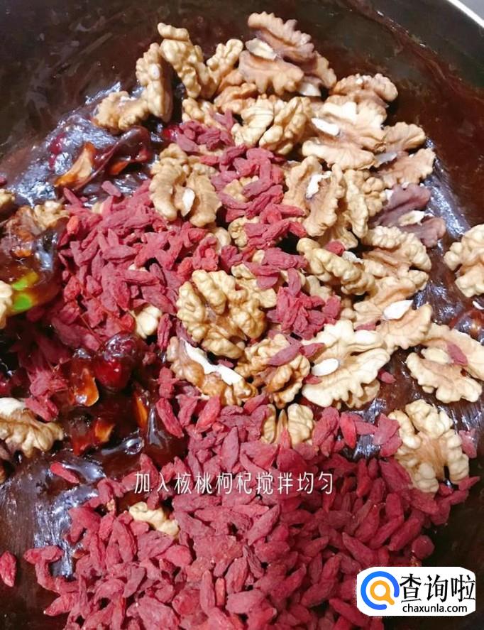 接着往锅中加入枸杞、核桃和红枣搅拌均匀,如下图所示。