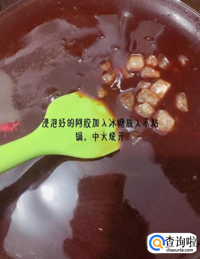 接着在浸泡好的阿胶中加入冰糖,倒入不粘锅中火烧开,如下图所示。