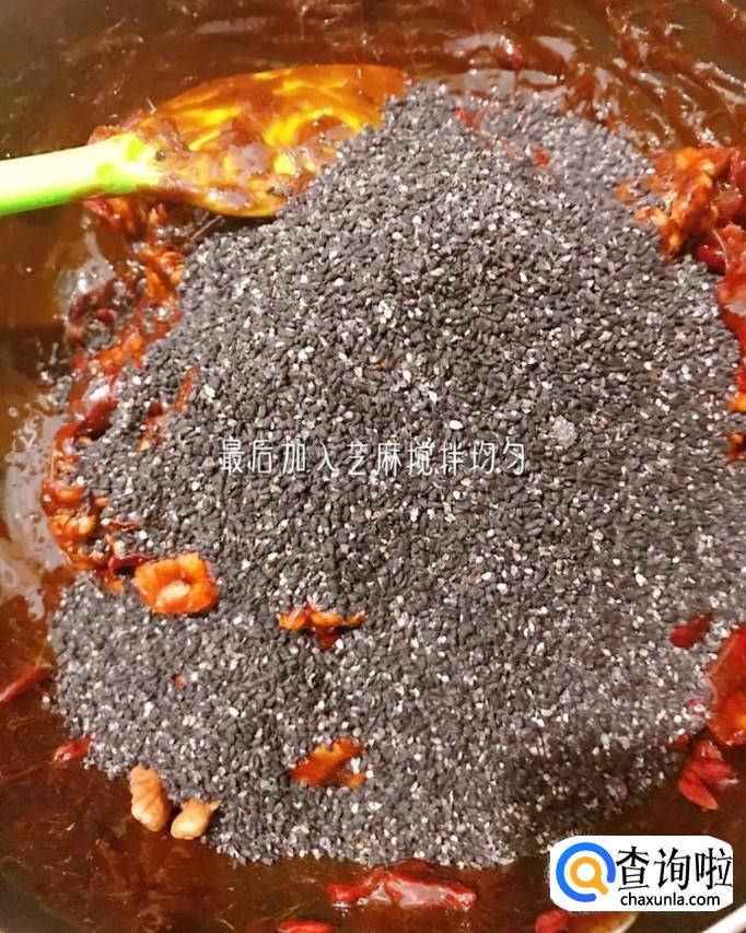 然后往锅中加入黑芝麻搅拌均匀,如下图所示。