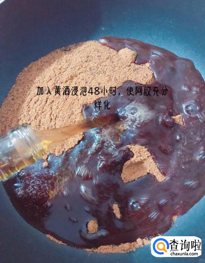 然后把阿胶倒进容器中加入黄酒浸泡48个小时,如下图所示。