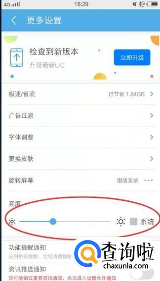 会弹出【更多设置】窗口,在下方找到【亮度】,然后通过移动砝码调节屏幕的亮度,如下图所示: