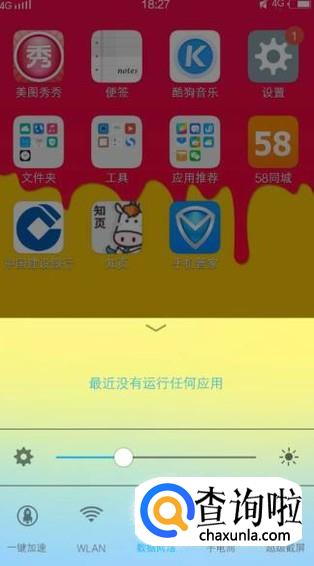 用手从手机屏幕下方向上拉动,会弹出一个上拉菜单,如下图所示: