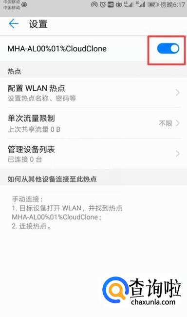 弹出的界面,我们将热点的开关向右滑动打开就可以了。还是比较简单的,相信大家现在都会了。
