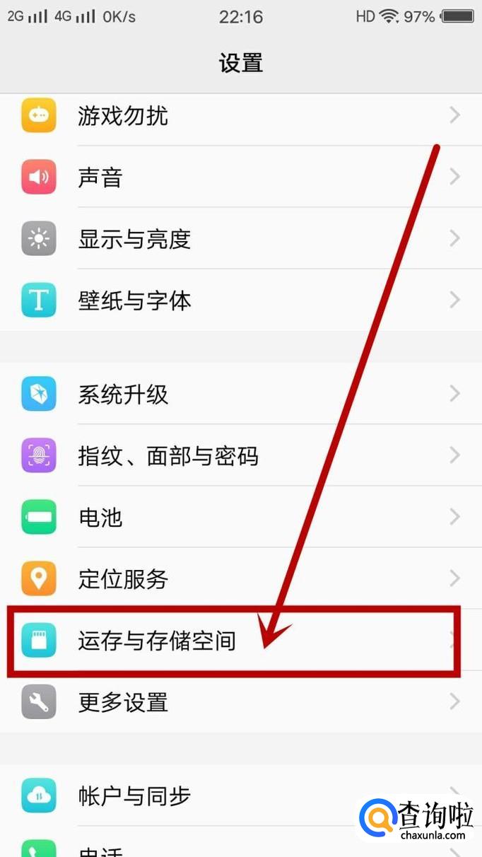 打开手机设置,点击“运行与存储空间”,如图所示。