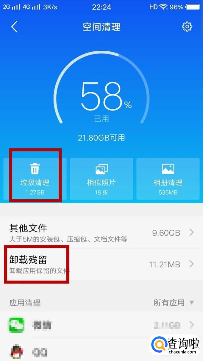 在“空间管理”页面,我们可以点击“垃圾清理”、“卸载残留”等进行内存整理,如图所示。