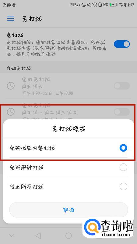 我们再来看看防打扰模式的时间,可以知道这里设置的是全天免打扰。如果想要重新设置免打扰时间可以自己修改。