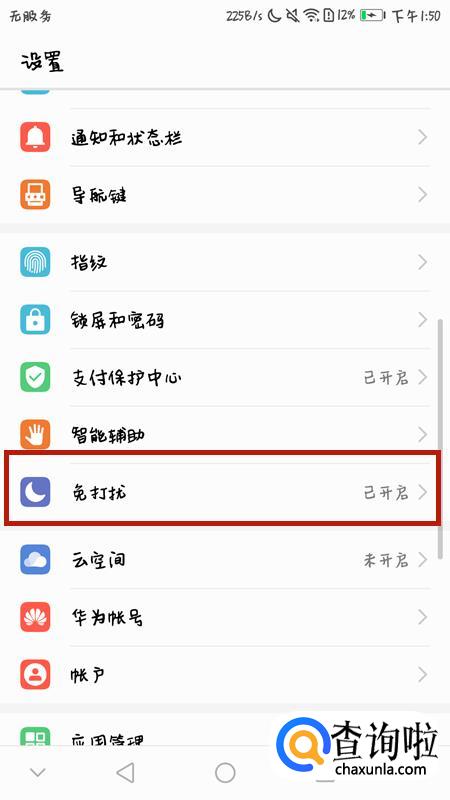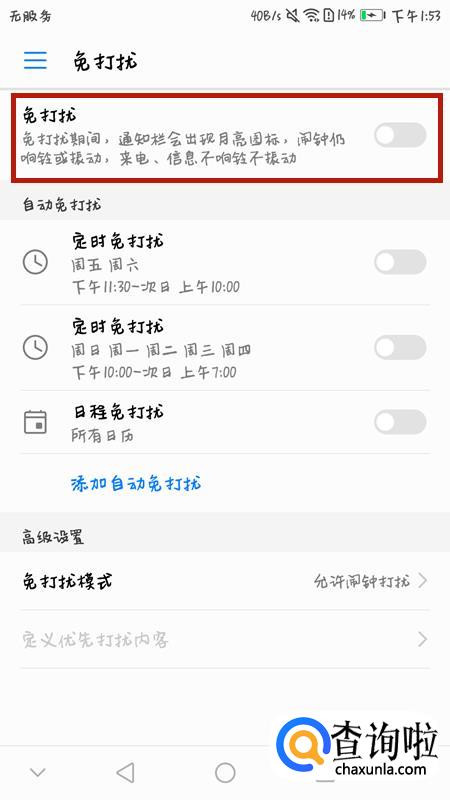 在设置中我们可以看到防打扰模式是开启的,这就是别人打不进电话的根本原因。
