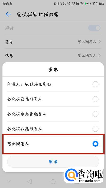 进入防打扰模式以后,我们可以看到设置的是禁止所有人来电。这样就出现了所有人都打不进来电话的情况。
