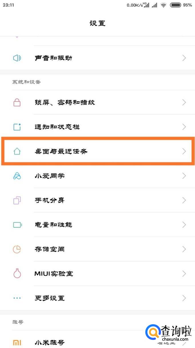 接下来我们要在众多的设置里面找到“桌面与最近任务”菜单,并点击进入。