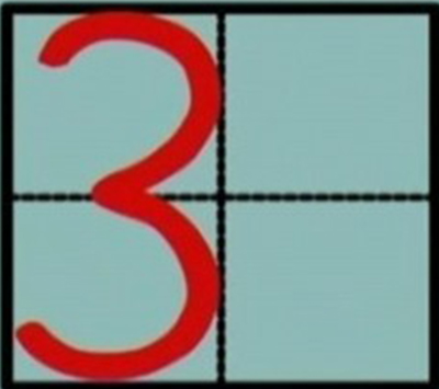 “3”起笔不碰线,向上碰线,再向下碰线,略成半圆向中间弯,在虚线以上转向右下方碰线,向下碰底线,最后,弯向上碰线。