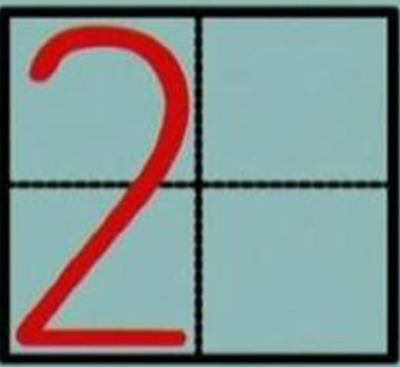 “2”起笔碰左线,再向上、向右碰线,略成半圆,斜线到左下角,碰线一横。