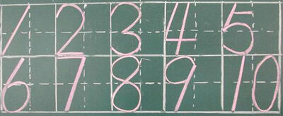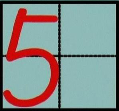 “5”从上线不到一半的地方起笔,向左下到中格角,再向上超过中线画一个大半圆碰右线,下线到左线为止。最后,在上面画一横线。