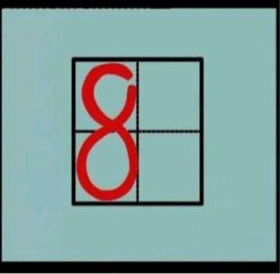 “8”从右上碰线到左线成半圆,拐向右下面成圆碰右线,下线、左线,在向上,在中线以上和原线相交,最后,线到右上角附近稍离起笔处为止,不封口。