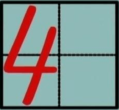“4”从上线的中间起笔,向左斜线到下格,碰左线再折右碰线。第二笔从右上角附近下去,到下面的当中碰线。