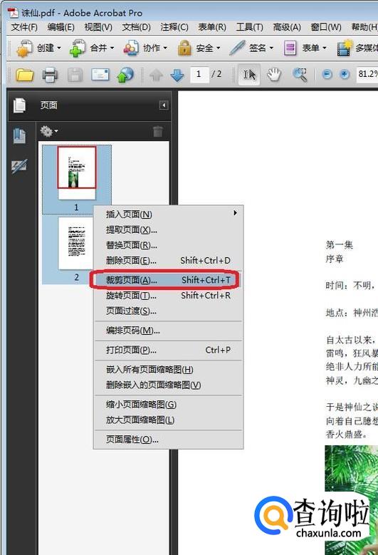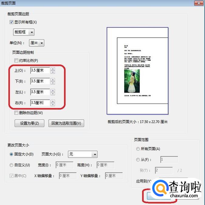 右键点击,选择“裁剪页面”,出现“裁剪页面”选项框,通过调整图中边距(注意同时观察右边图形中出现的裁剪线),设置好上下左右的边距后,点击“确定”。