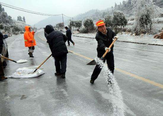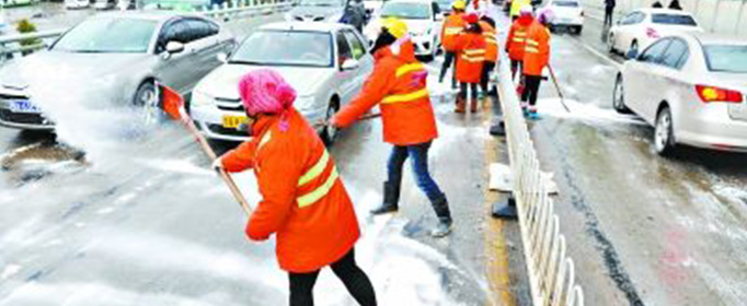 在雪表面撒上盐之后,只要雪稍微融化一点,盐就能将雪水吸收并形成盐水溶液,因为盐水溶液的凝结点比水要低很多,在同样的温度下不容易凝结成冰,在这样的条件下,雪就会不断地被融化,道路的安全性也就大大提高了。工作人员正是利用了这一物理特性,所以用盐水来化积雪,防结冰。
