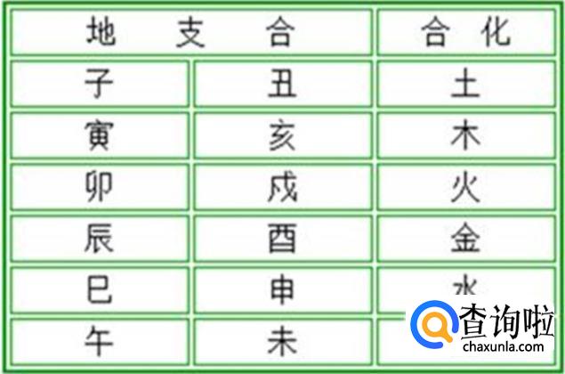 地支六合:子丑相合土,寅亥相合木,卯戌相合火,辰酉相合金,巳申相合水,午未相合土