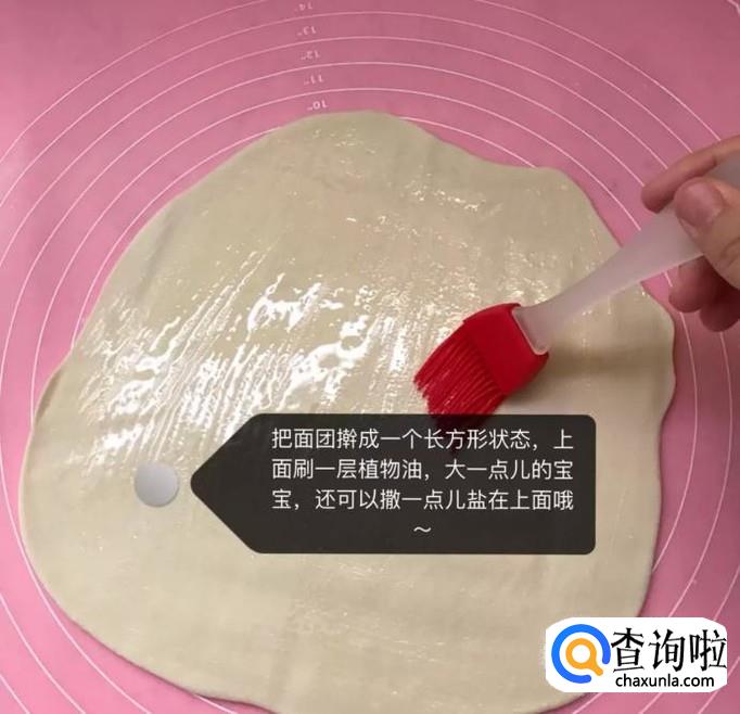 然后将面团用擀面杖擀成薄饼并刷上一层油,如下图所示。