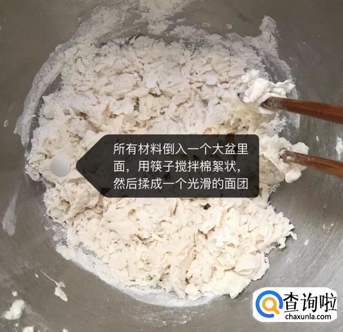 然后把所有的食材倒入一个大盆里,用筷子搅拌成棉絮状,如下图所示。