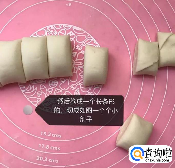接着将面饼卷起来,切成长方形的块,如下图所示。
