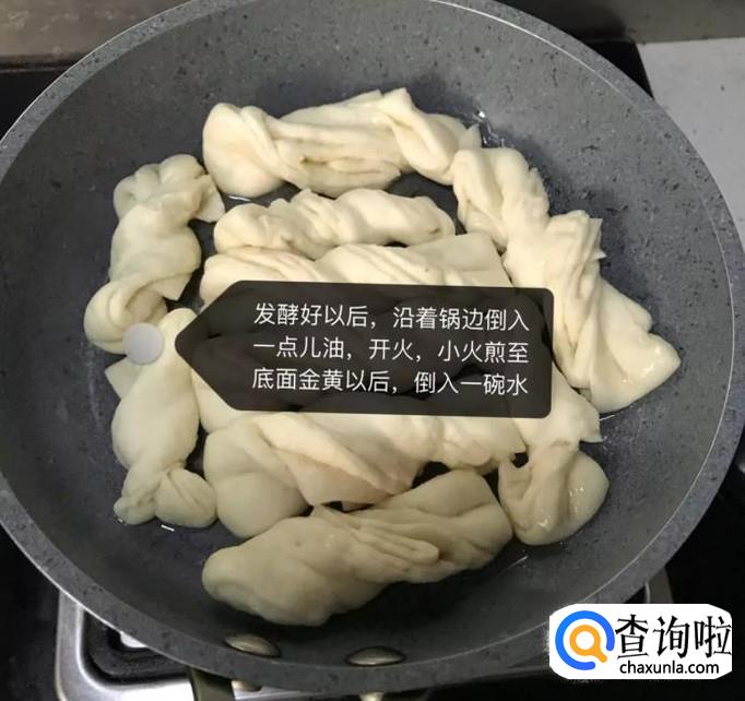 接着将醒发好的花卷放入锅中,沿边缘倒入一些油,如下图所示。