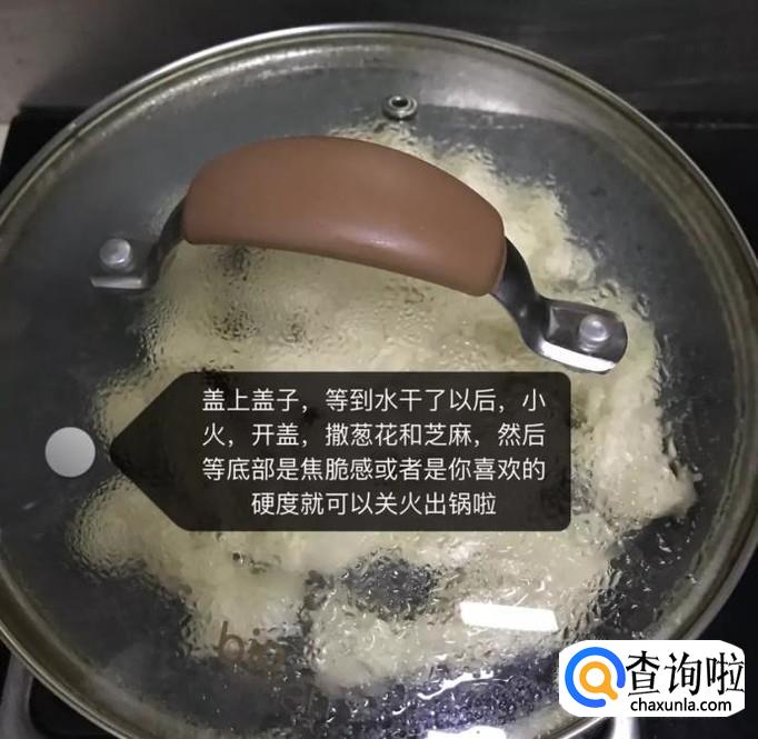 然后等到底部略微呈金黄色,加入一碗水,盖上盖子,开小火焖十分钟,如下图所示。小贴士:大家在这一步的时候可以想象自己喜欢吃的芝麻或者是葱花都是可以的。