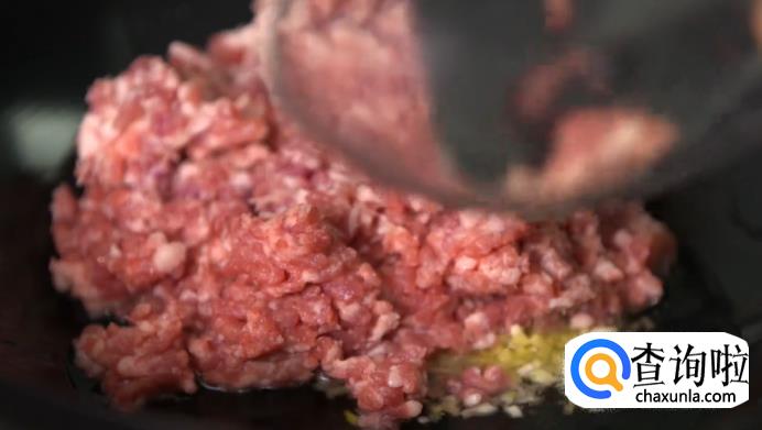 热锅起油,放入姜末、蒜末进行爆香,再倒入肉糜煸炒,用铲子将肉糜充分打散。