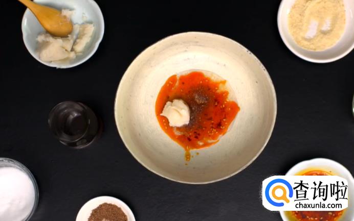 接下来打碗底,在面碗中加入蒜水、红油、麻油、盐、鸡粉、红花椒粉和猪油备用。