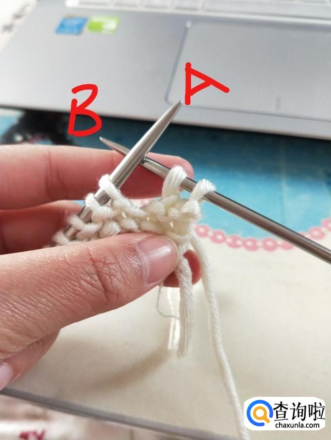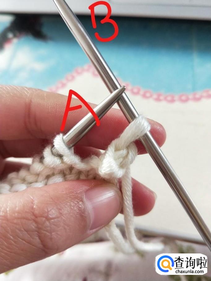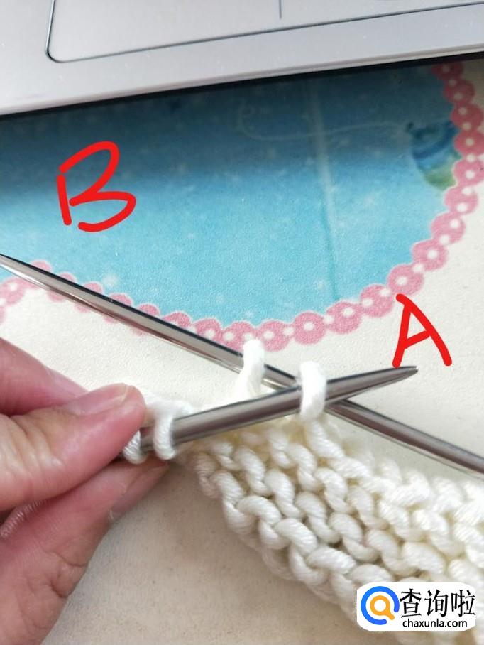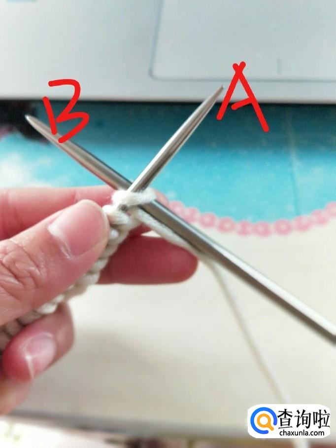 行针:右手握B针,从箭头处穿过,右手将毛线从B针下方绕上来并置于A针下方,稍稍拉一下,B针将刚才绕的线挑起,A针退出,第一针就织好了
