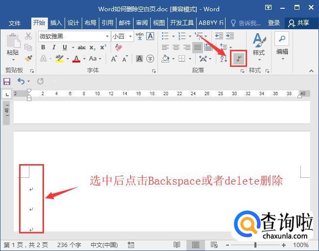 有时候格式标记会被隐藏起来,直接进入【开始】-【段落】-【点击】-【显示/隐藏编辑标记】。这时候页面上会显示出隐藏的标记,在要删除的空白页上选中标记,删除即可。