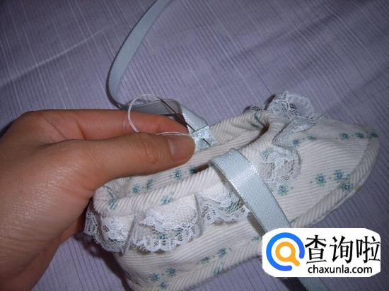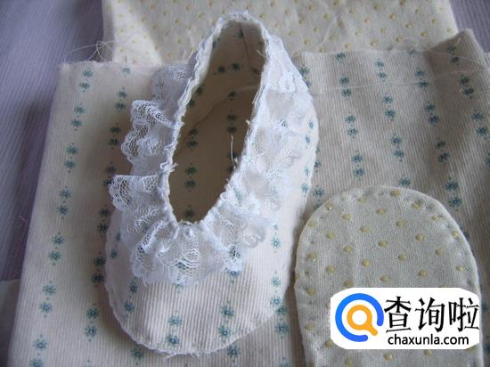 鞋后跟缝和,再在鞋边缝上一圈蕾丝花边,再用宽约2CM左右的同花色布条包好鞋面的两边。