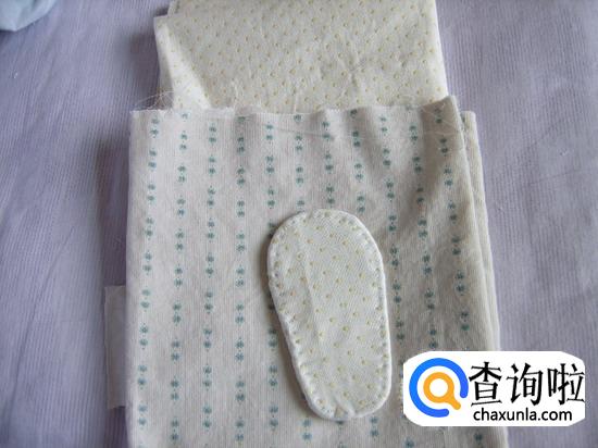 在纳好的鞋底外面包上点塑布,正在学步阶段的宝宝,布纳的底会有点滑,所以还是防滑底好。鞋底的另一面,先放一层针刺棉,再包上同鞋面一样的细灯芯绒布,再将两层用细细的针脚纳起来。