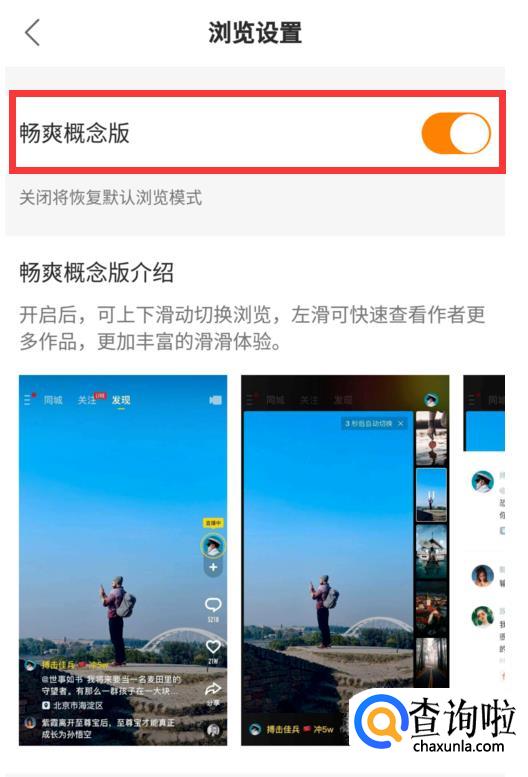在浏览设置中,打开“畅爽概念版”右侧的开关(橙色为打开)即可。